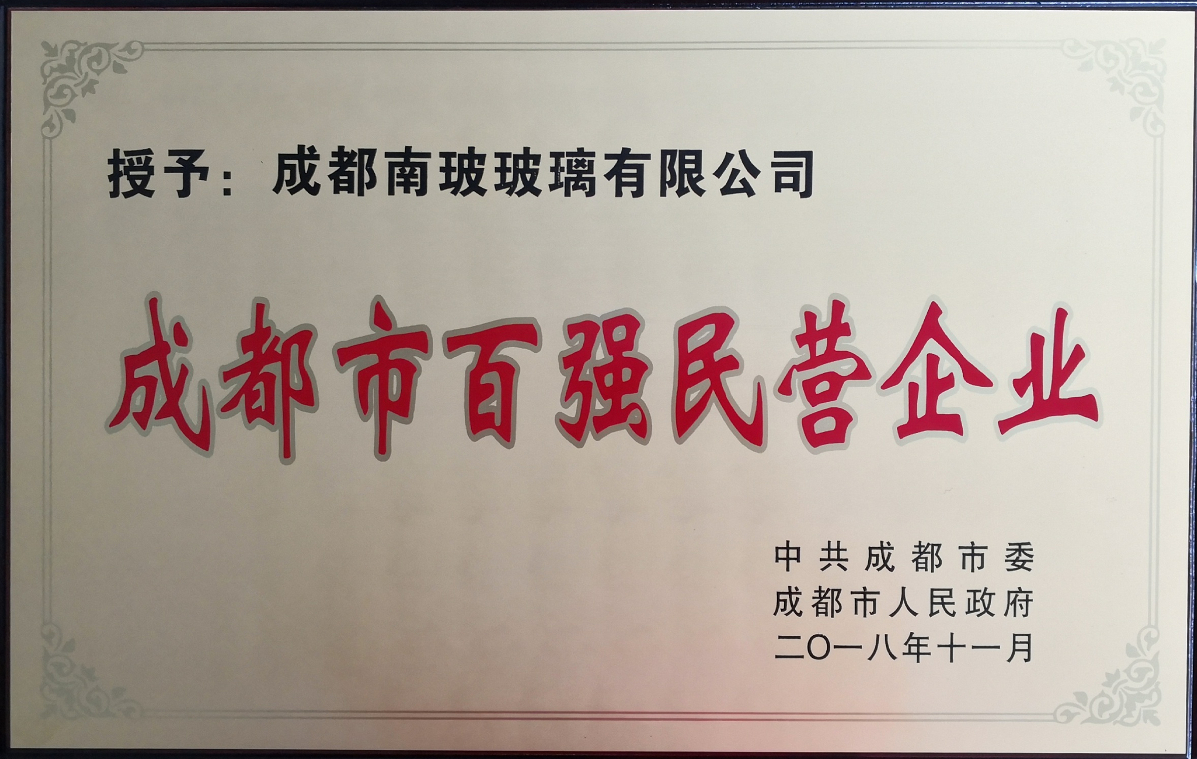 近日,在2018年成都市民营经济健康发展大会上,成都南玻玻璃有限公司(简称“成都南玻”)荣膺由中共成都市委、成都市人民政府联合颁发的“成都市百强民营企业”荣誉称号。