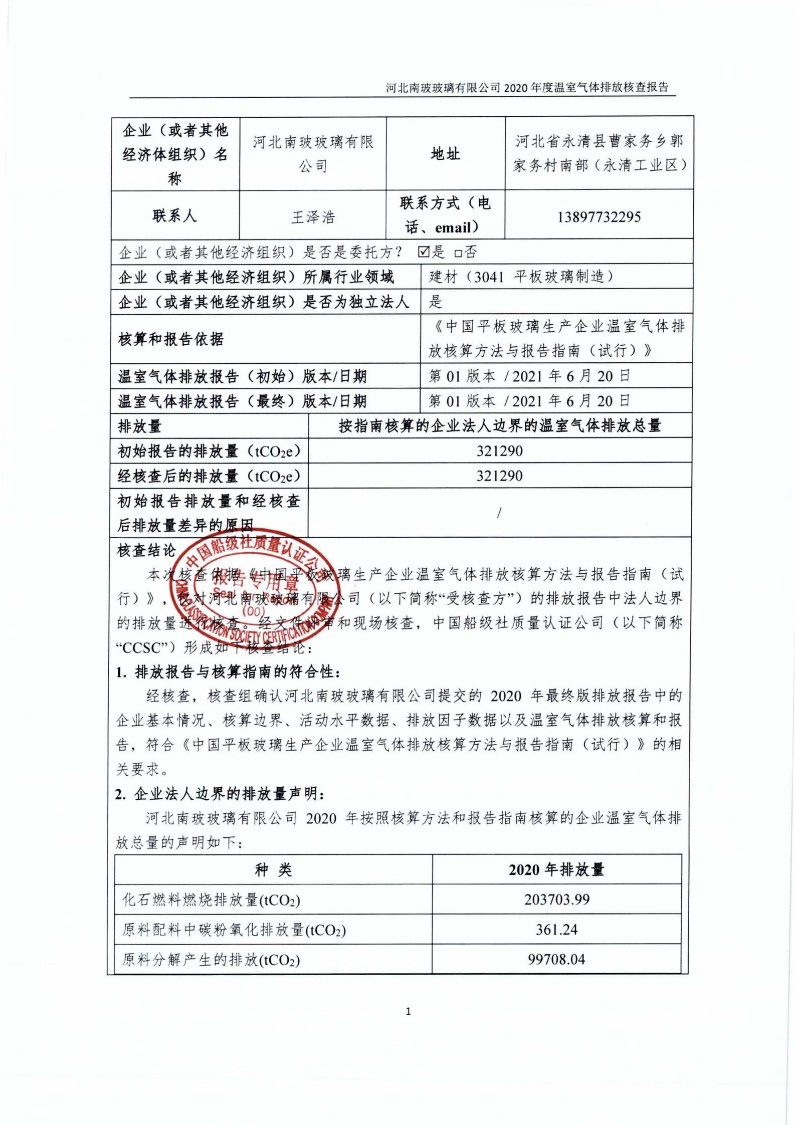 河北南玻玻璃有限公司2020年温室气体排放核查报告