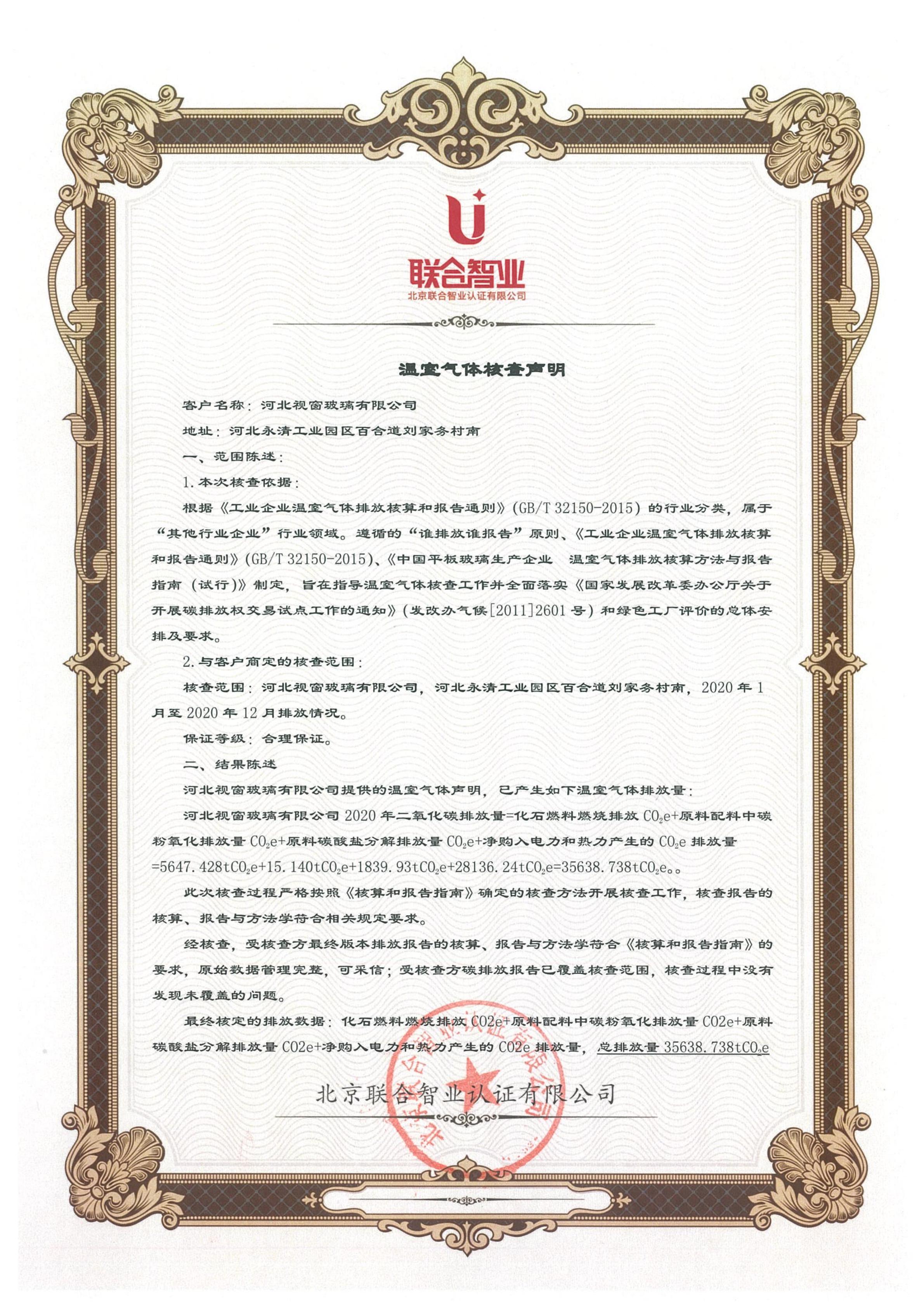 河北视窗玻璃有限公司温室气体核查声明